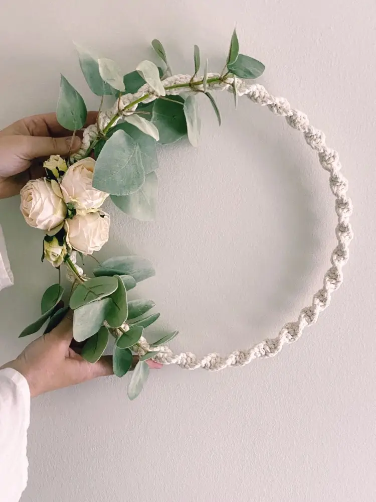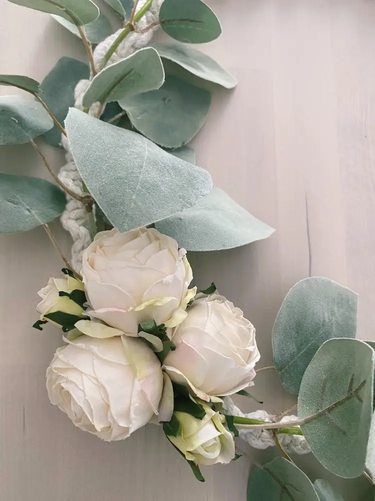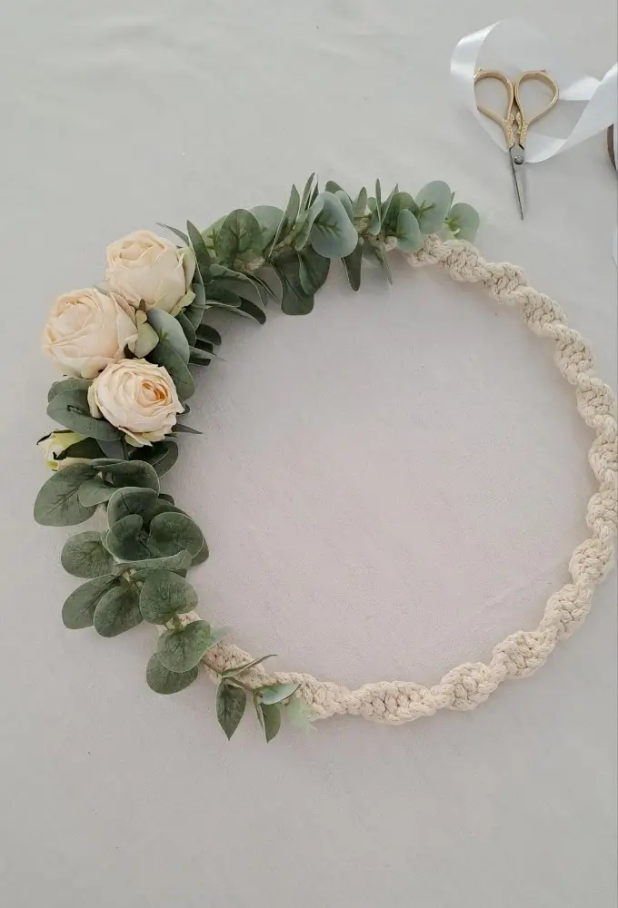 Έχει δημιουργηθεί με macrame τεχνική, κλαδιά ευκαλύπτου και τεχνητά τριαντάφυλλα άριστης ποιότητας με φυσικό αποτέλεσμα.